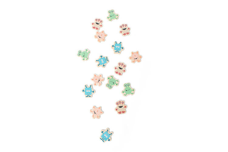 - 16 drewnianych puzzli potworków (4 x 4 cm),
