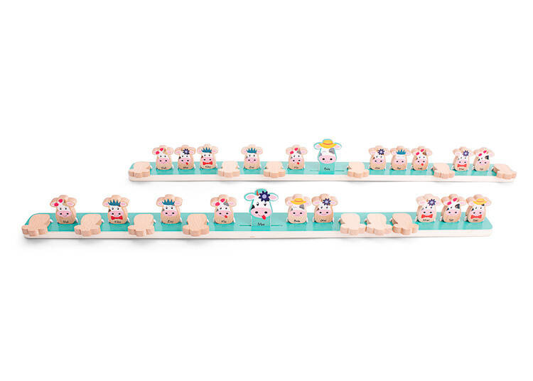 Logiczna gra dla najmłodszych dzieci. Duże elementy są wygodne nawet dla mniejszych rączek. Prosta gra, w którą można grać z maluchem godzinami i nigdy się nie nudzi. Jest wykonana 100% FSC i charakteryzuje się uroczą grafiką. Słodkie krówki umieszczone są na dłuuuuugiej drewnianej podstawie ( 57 cm) przy pomocy gumek. Dzięki temu możesz zabrać grę ze sobą również w podróż i żaden element się nie zgubi.