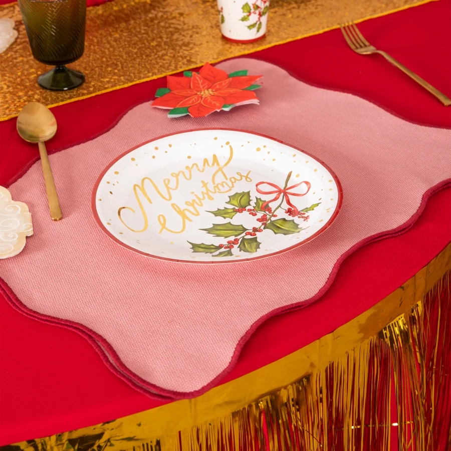 Talerzyki papierowe w świąteczny, bożonarodzeniowy wzór to praktyczne i estetyczne rozwiązanie na bożonarodzeniowe spotkania, przyjęcia lub rodzinne uroczystości. Ich elegancki design z gałązką ostrokrzewu wprowadza ciepły, zimowy nastrój, a wygoda użytkowania sprawia, że są idealne zarówno do napojów ciepłych, jak i zimnych.
