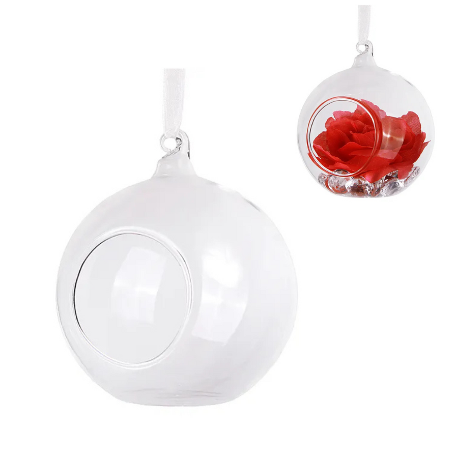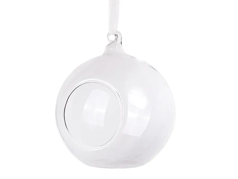 Szklana kula dekoracyjna z otworem to elegancki dodatek, który umożliwia tworzenie wyjątkowych aranżacji. Produkt wyposażony w ozdobną wstążkę, dzięki czemu jest gotowy do zawieszenia, na przykład na choince, oknie czy w dowolnym miejscu w domu.