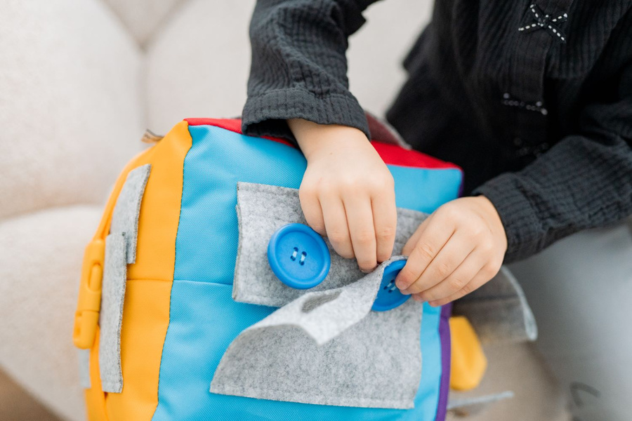 - Umiejętności manualne: Zabawa kieszonkami, zapinanie i odpinanie ćwiczą małą motorykę.