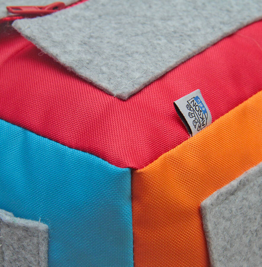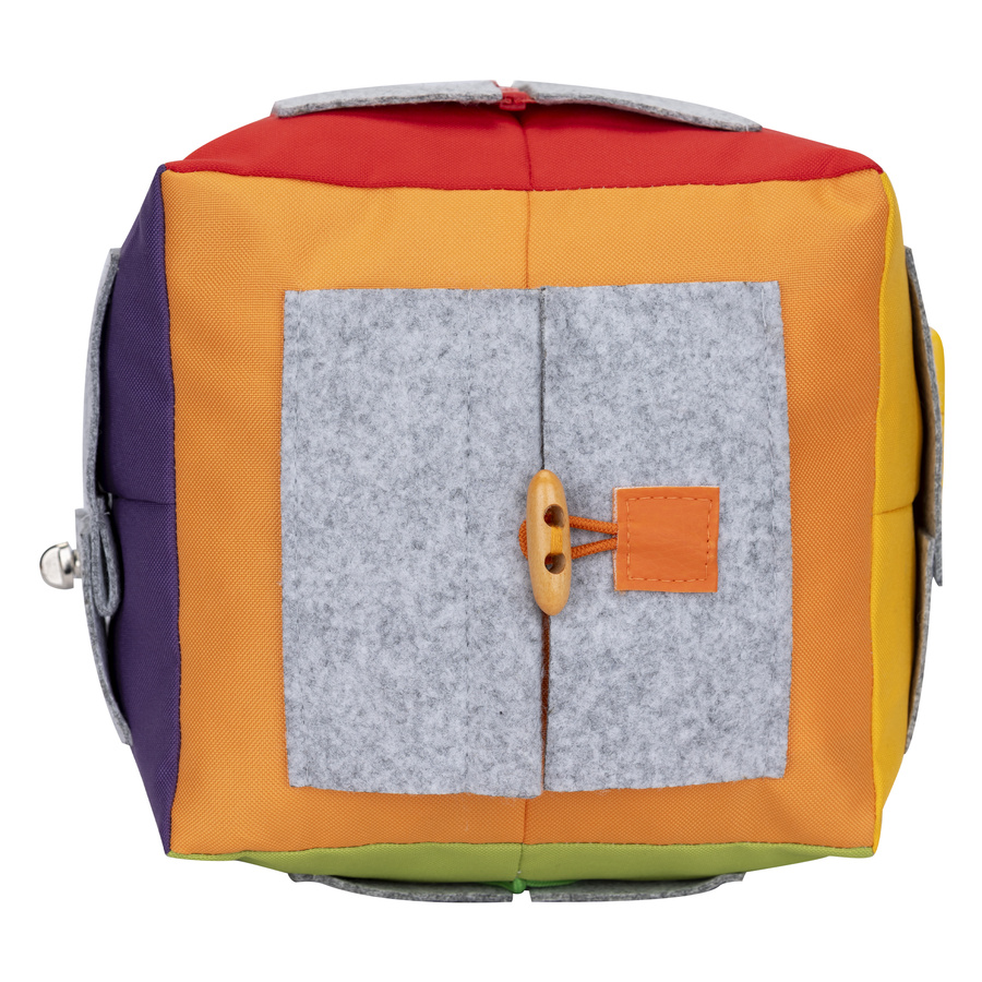 - Kieszonki: Każda ścianka kostki zawiera kieszonkę, zachęcające dziecko do wkładania i wyjmowania przedmiotów, co rozwija koordynację ręka-oko.