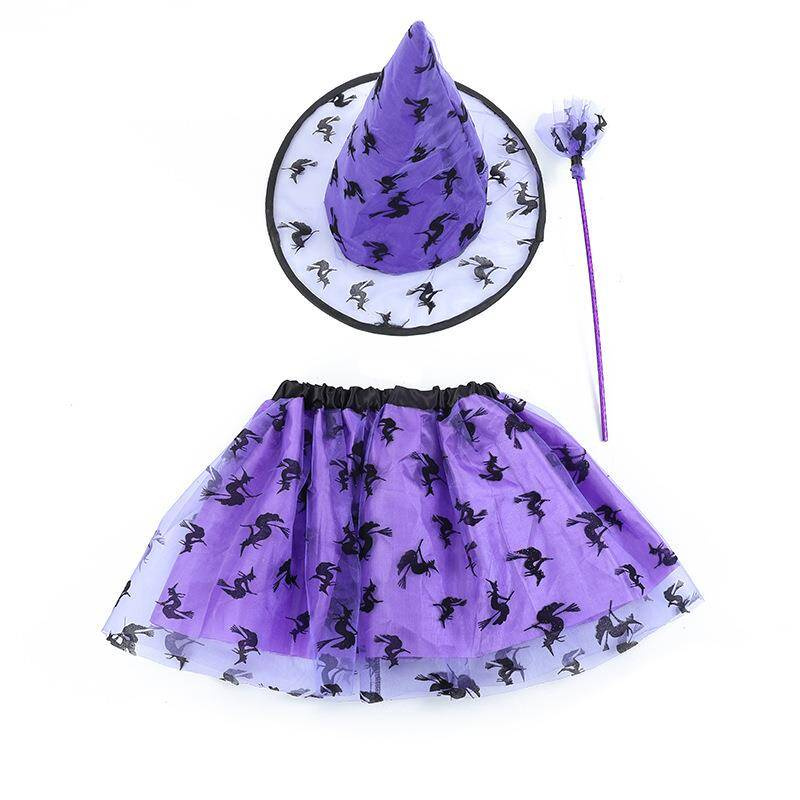 - Zestaw Czarownicy w kolorze fioletowym, składa się ze spódniczki tutu, kapelusza i różdżki, zapewniając niezapomnianą przygodę w świecie magii.