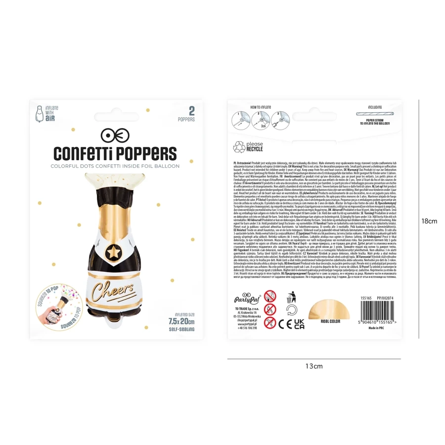 Dodaj blasku i radości każdemu przyjęciu z zestawem balonów foliowych w kształcie butelki z napisem "Cheers"! Idealne na imprezy sylwestrowe, noworoczne, urodziny czy wesela. Każda butelka "strzela" konfetti, tworząc spektakularny efekt, który zachwyci gości.