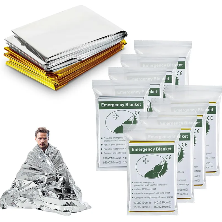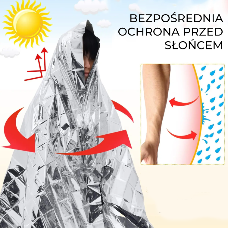 - Dwustronna folia NRC – strona srebrna zatrzymuje ciepło ciała, natomiast strona złota odbija promienie słoneczne, chroniąc przed przegrzaniem.