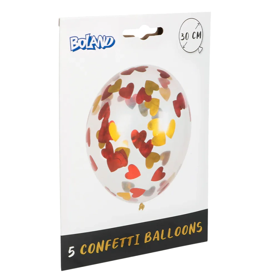 • Zestaw 5 transparentnych balonów z umieszczonym w środku czerwono złotym konfetti w kształcie serduszek.