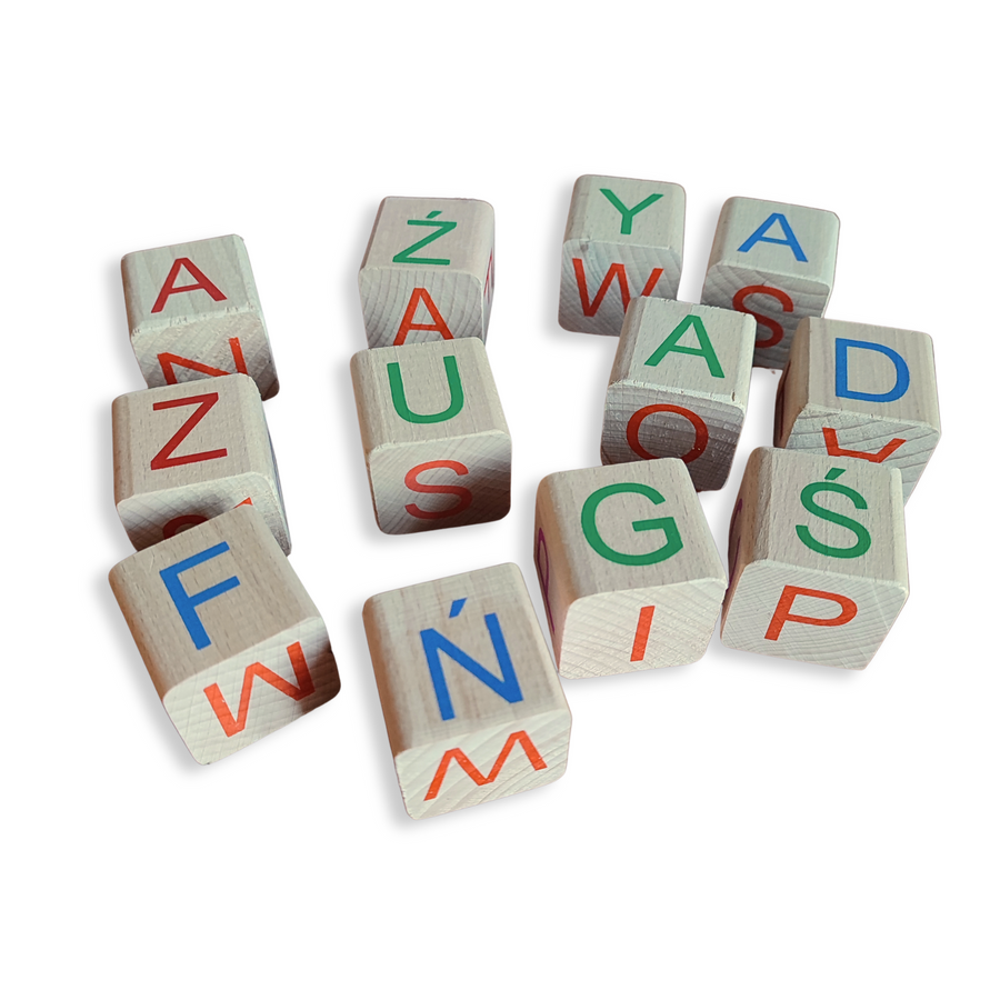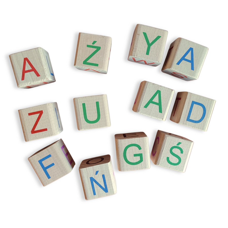 - 12 klocków o wymiarach 3,4 x 3,5 x 3,7 a na nich 72 kolorowe litery - pełny alfabet polski od A do Ź z powtarzającymi się najczęściej używanymi literami