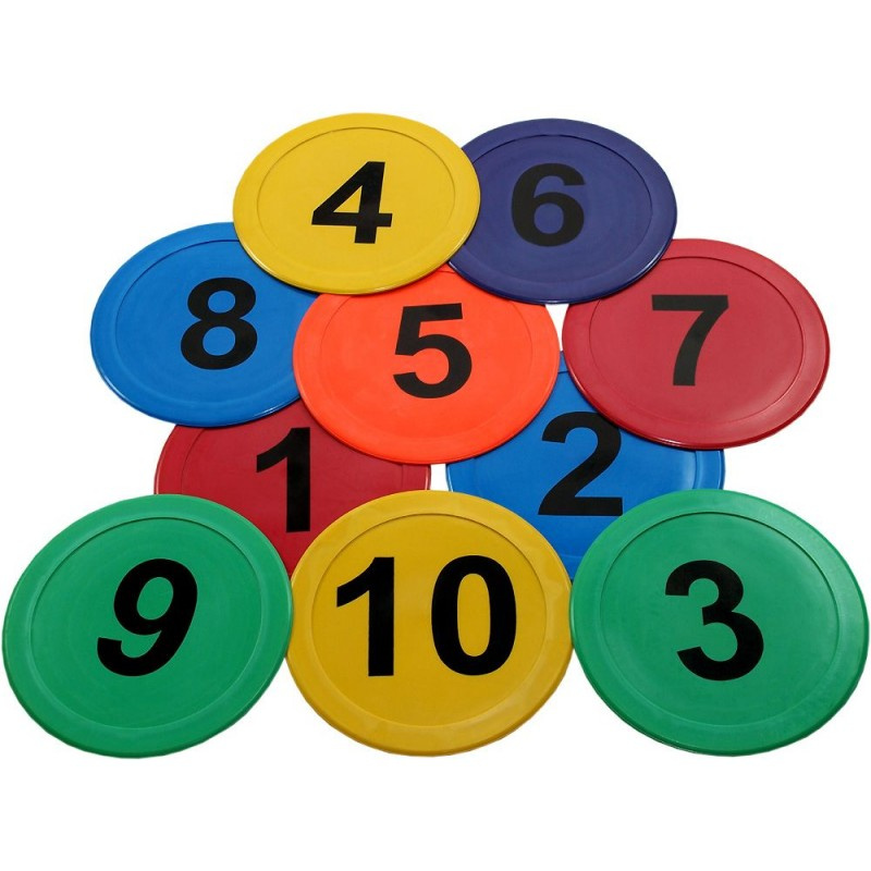 • Krążki numerowane, edukacyjne na podłogę. Można wykorzystywać je do wszelkiego rodzaju gier rzutowych, zabaw edukacyjno-ruchowych itp.
