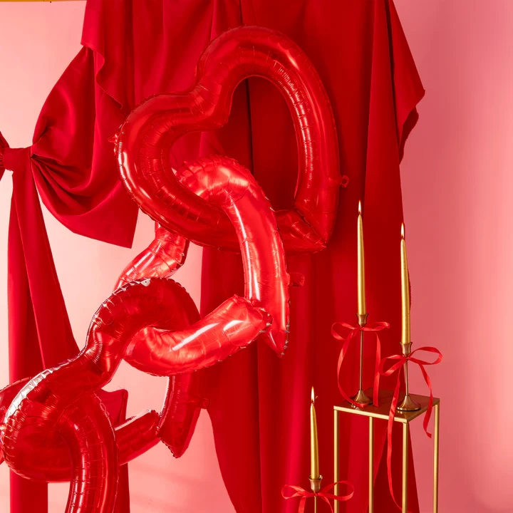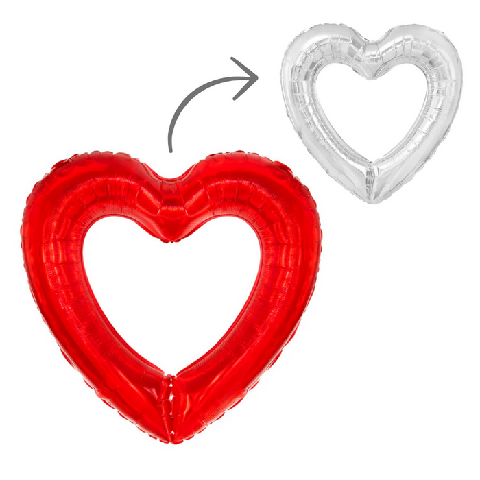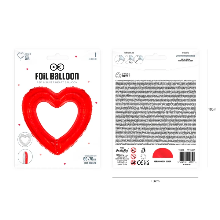Balon foliowy ramka w kształcie serca, dwukolorowy: z jednej strony czerwony, z drugiej srebrny. Daje nieograniczone możliwości tworzenia dekoracji: jako pojedyncza ozdoba lub połączona ze sobą w dłuższy łańcuch.