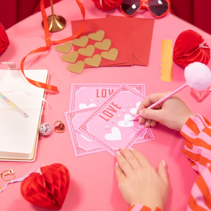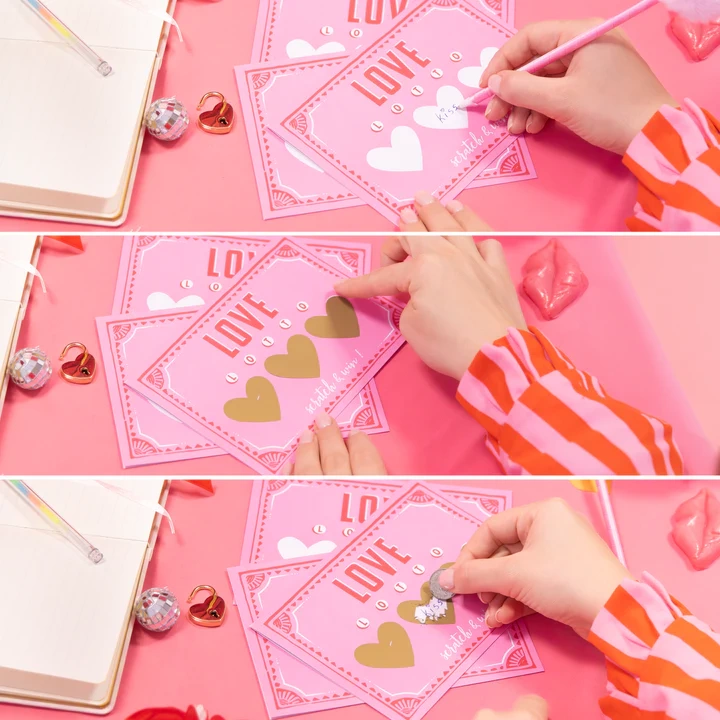 Zaskocz ukochaną osobę wyjątkowym gestem dzięki kartkom zdrapkom DIY! Walentynkowe kartki ze zdrapką, na każdej kartce 3 serduszka do zdrapania, w zestawie 9 naklejek-zdrapek.