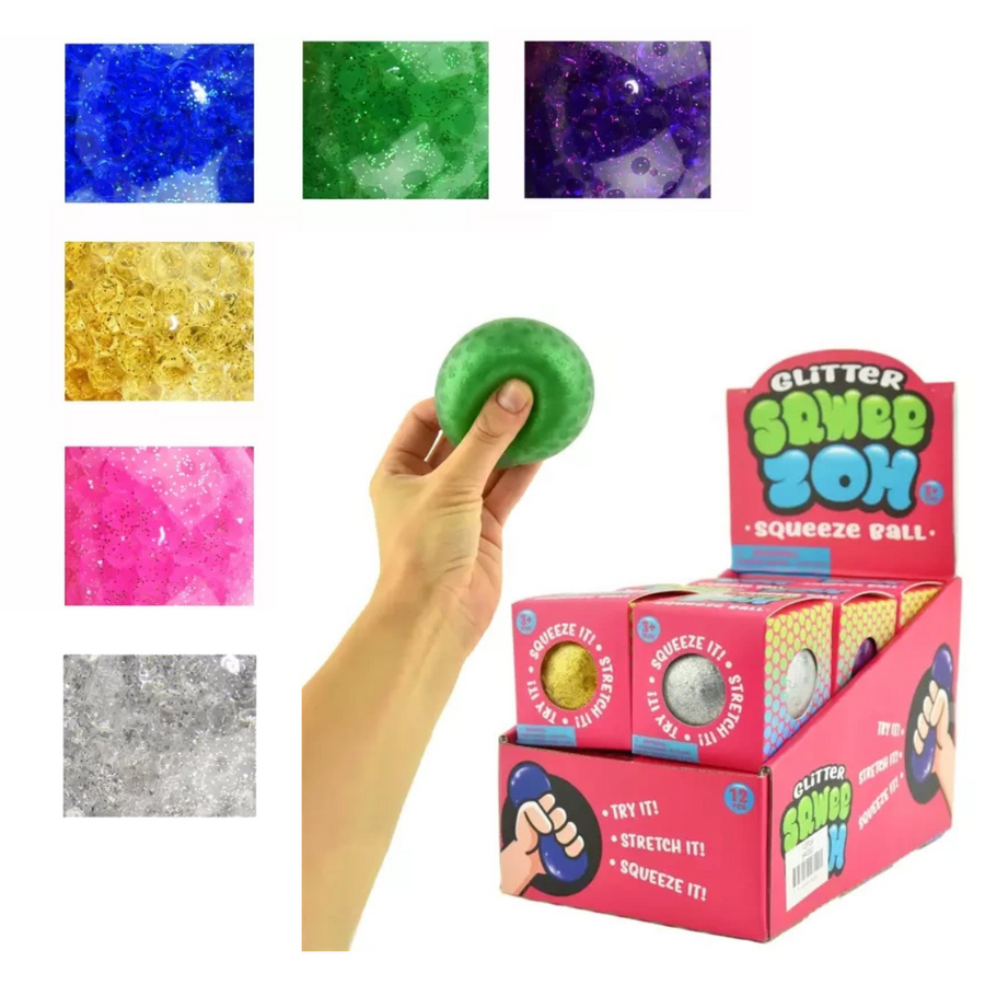 • Miękki gniotek w kształcie piłki wypełniony w środku kuleczkami i kolorowym brokatem.