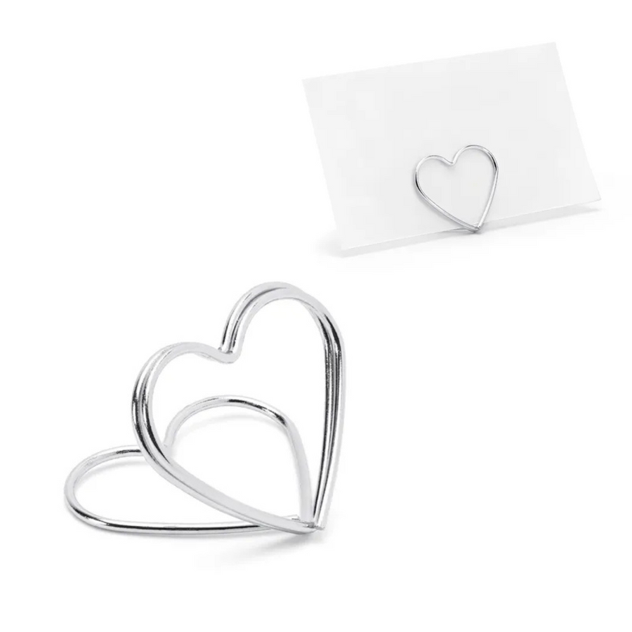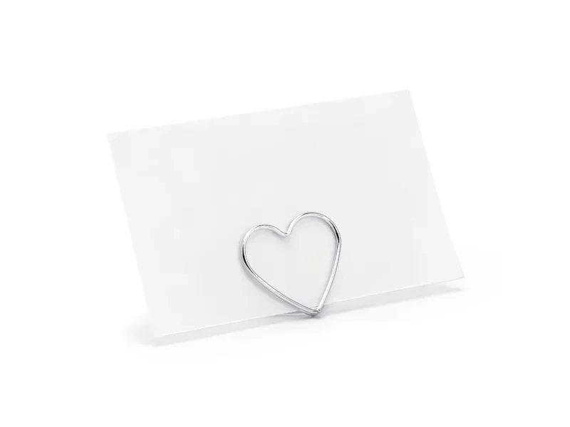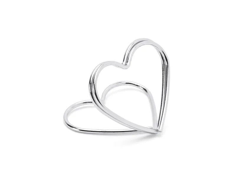 Zestaw 10 stojaków na winietki w kształcie serca. Wykonane są z wysokiej jakości metalu w kolorze srebrnym, o wysokości 2,5 cm.