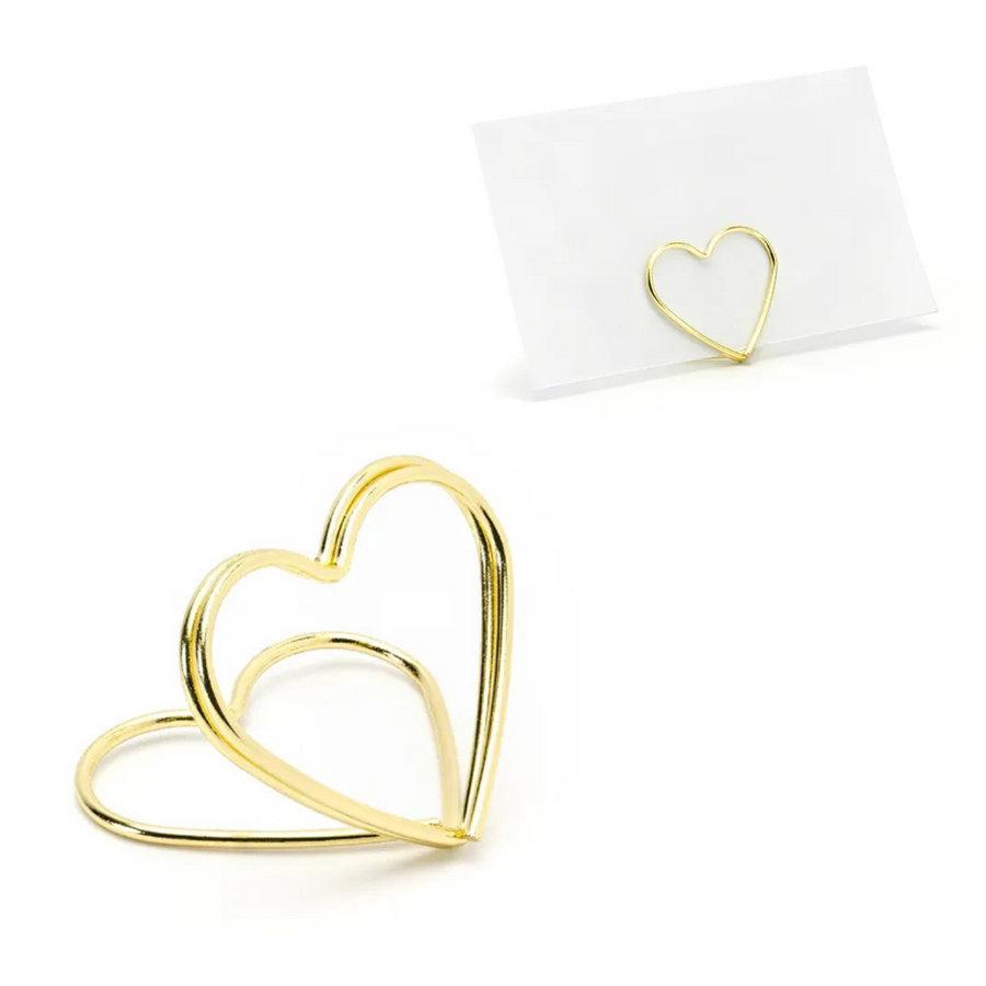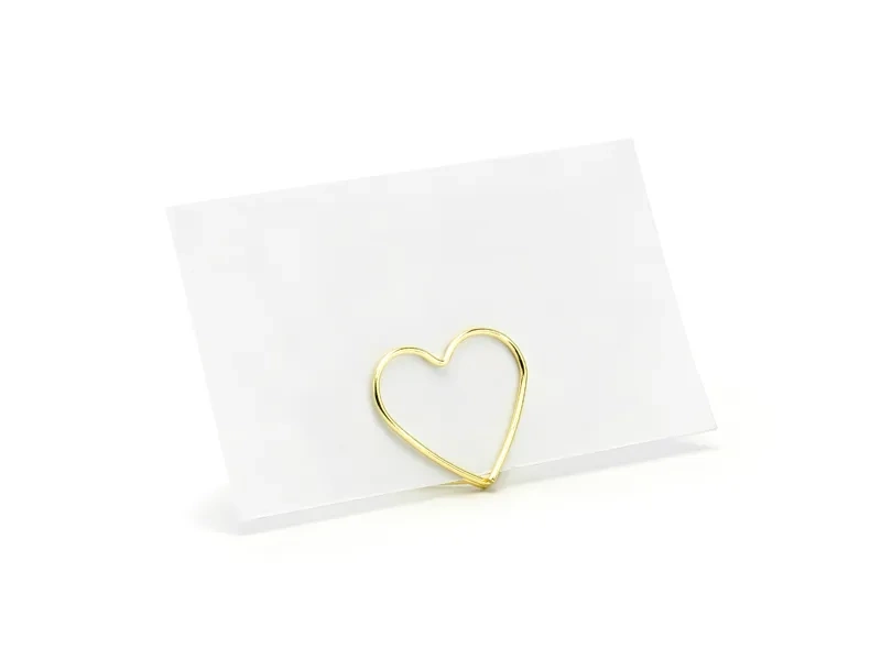 Zestaw 10 stojaków na winietki w kształcie serca. Wykonane są z wysokiej jakości metalu w kolorze złotym, o wysokości 2,5 cm.
