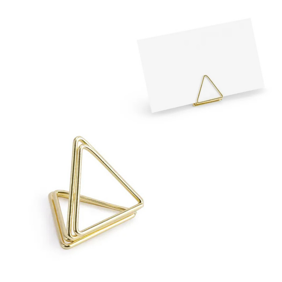 Zestaw 10 stojaków na winietki w kształcie trójkątów. Wykonane są z wysokiej jakości metalu w kolorze złotym, o wysokości 2,3 cm.