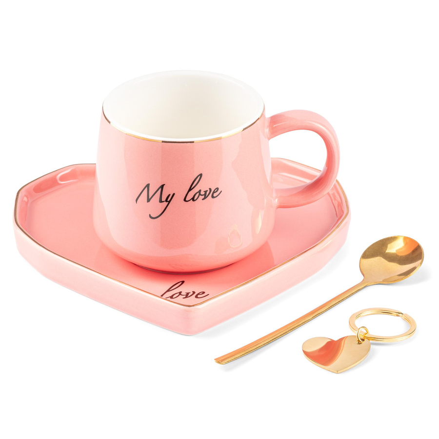 - ceramiczna filiżanka na podstawce w kształcie serca, złota łyżeczka oraz brelok serduszko (można zlecić np. dedykację u grawera)