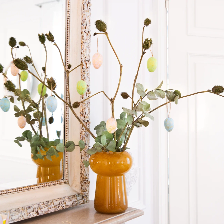 Zestaw zawiera jajka w trzech różnych, pastelowych kolorach, które idealnie komponują się ze sobą, tworząc spójną i stylową dekorację. Te pozłacane pisanki będą doskonałym dodatkiem do koszyków wielkanocnych, bukietów, stołów oraz innych wiosennych aranżacji.