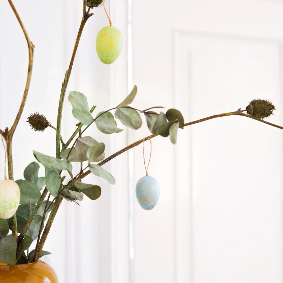 - Zestaw pastelowych pisanek, pozłacanych z jutowym sznurkiem.