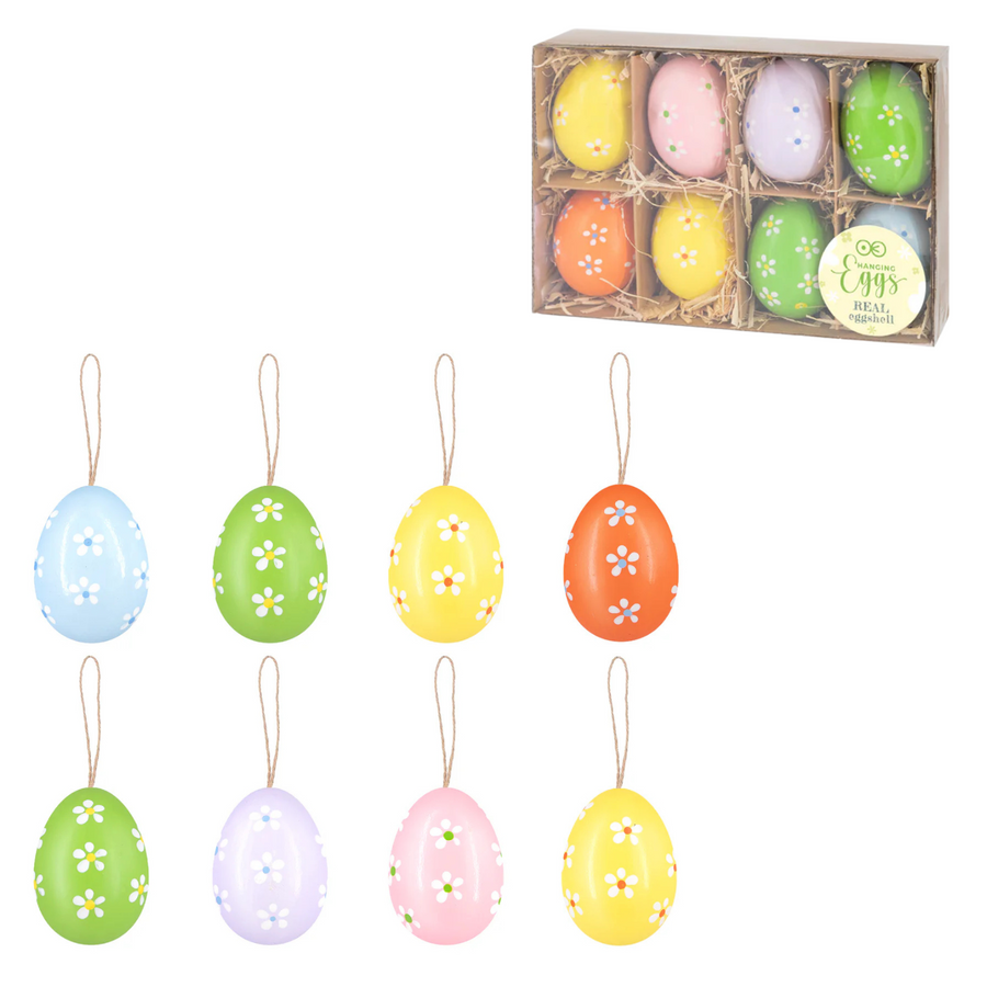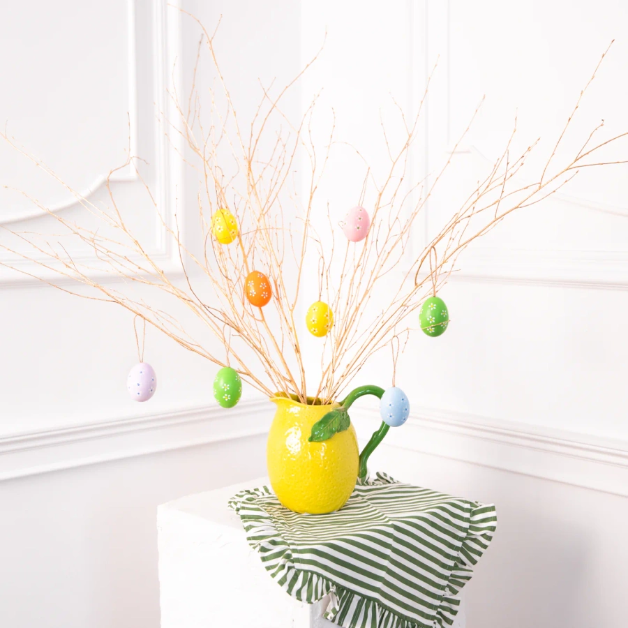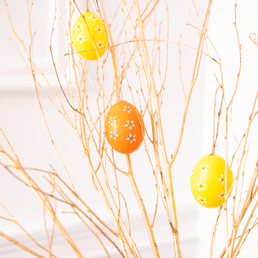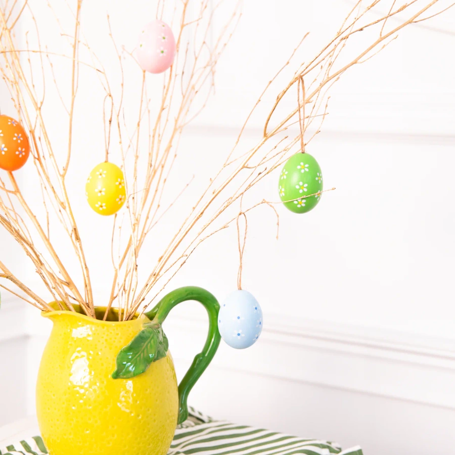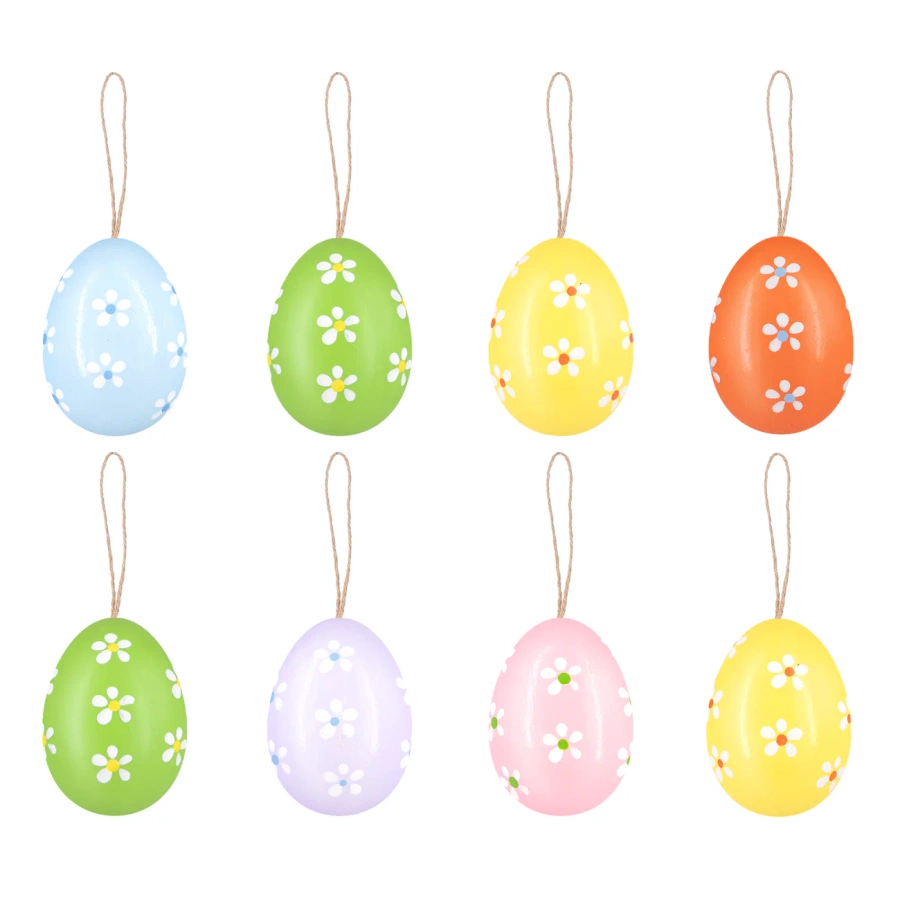 Pisanki zostały ozdobione delikatnymi, białymi kwiatkami, co nadaje im naturalny i artystyczny charakter. Każde jajko posiada jutowy sznureczek. Idealne do dekorowania stołów, koszyków, bukietów czy jako element wiosennej ozdoby w domu.