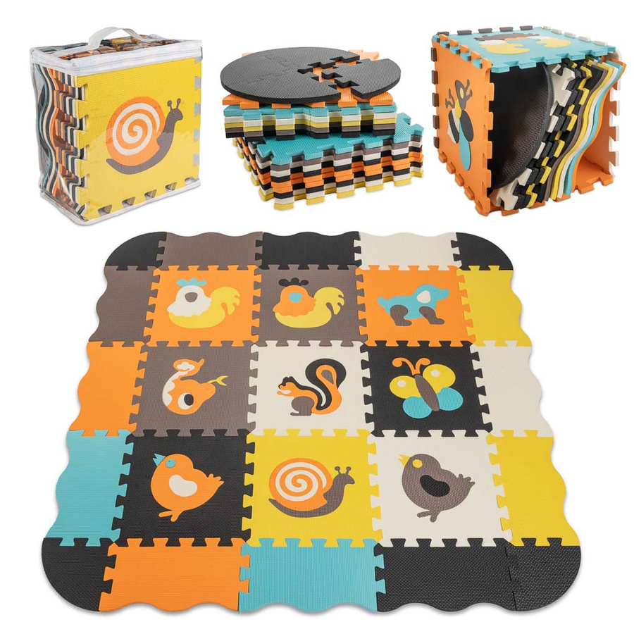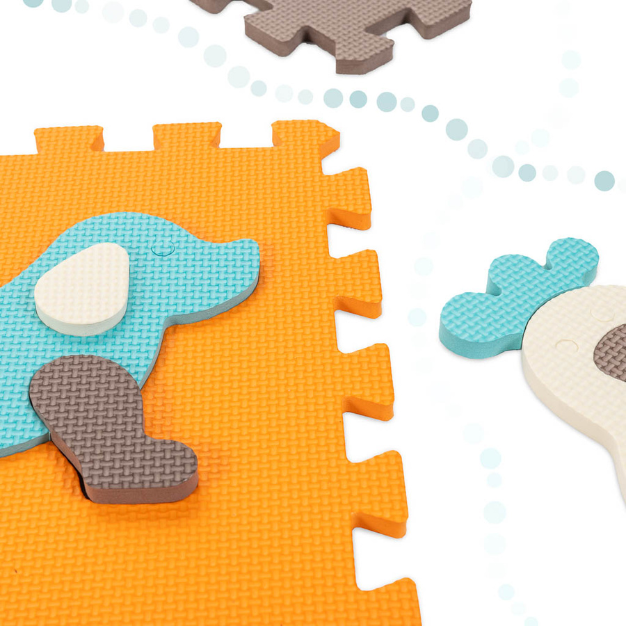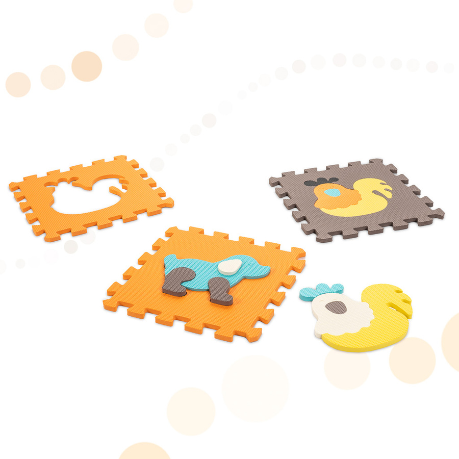 - Kolorowe puzzle piankowe z wyjmowanymi zwierzątkami. Mogą być matą do zabawy lub kojcem. Wodoodporna pianka ułatwi czyszczenie i odizoluje od zimnej podłogi. Ciekawa kolorystyka przyciągnie uwagę dziecka. W zest.: 9 puzzli i 16 ramek. Wym.: 114x114x1cm.
