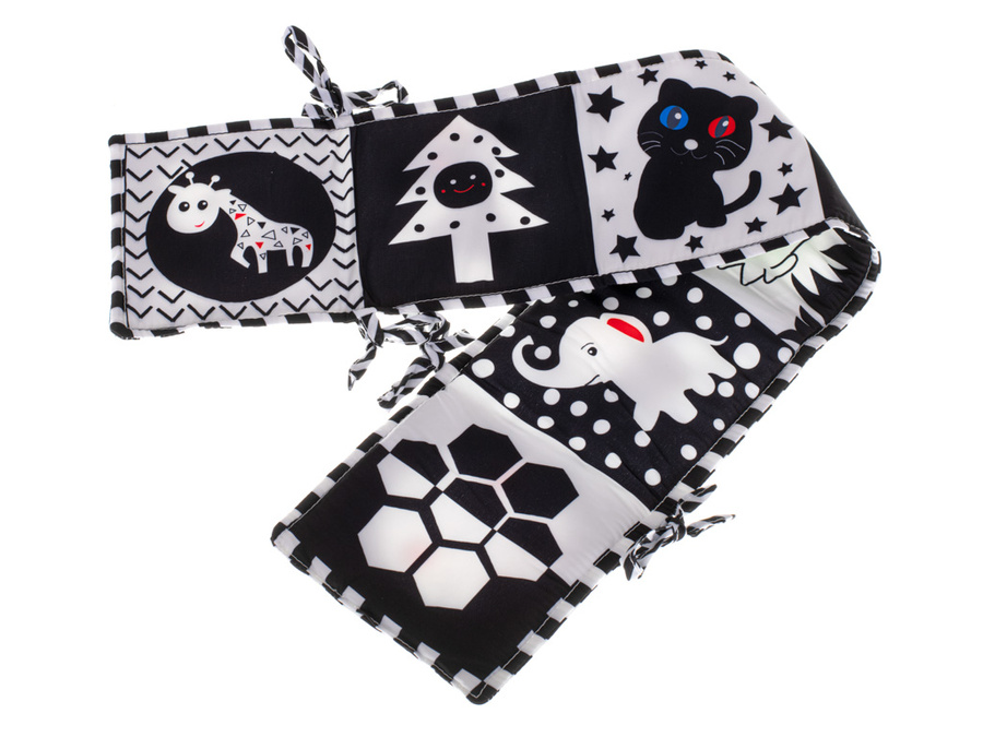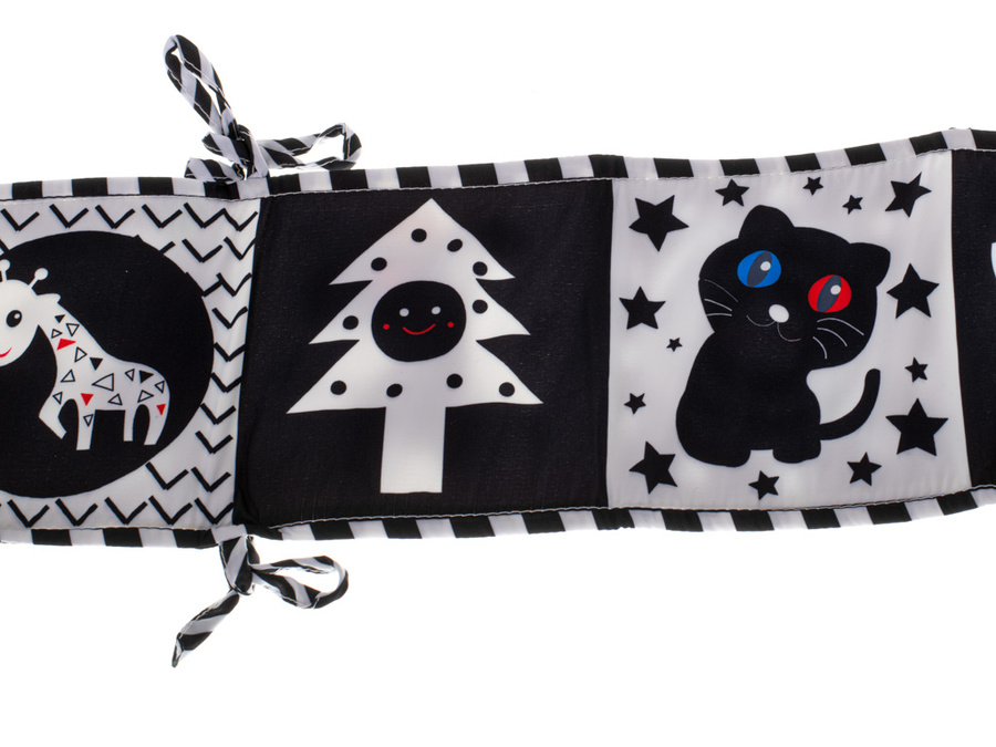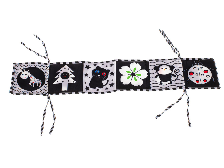 Książeczka w kształcie harmonijki świetnie sprawdzi się w roli maty ochronnej do łóżeczka. Za pomocą sznureczków przymocujesz ją do szczebelków.
