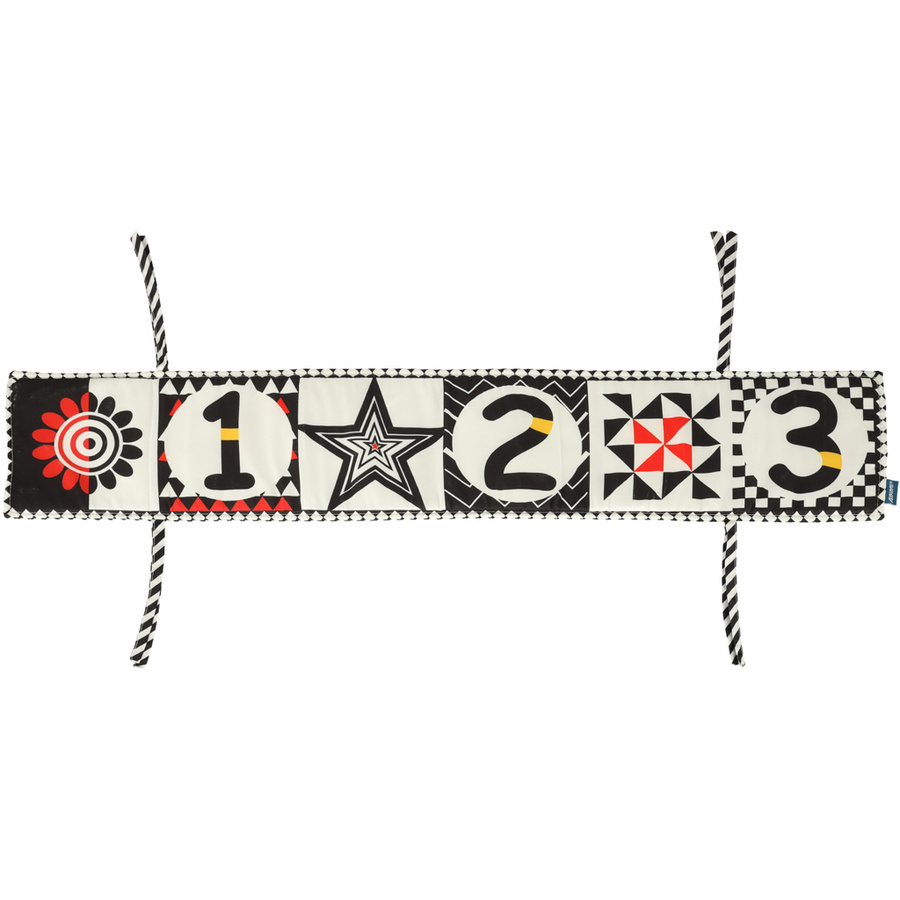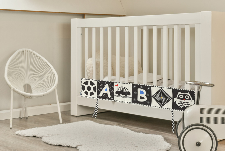 Książeczka w kształcie harmonijki świetnie sprawdzi się w roli maty ochronnej do łóżeczka. Za pomocą sznureczków przymocujesz ją do szczebelków.