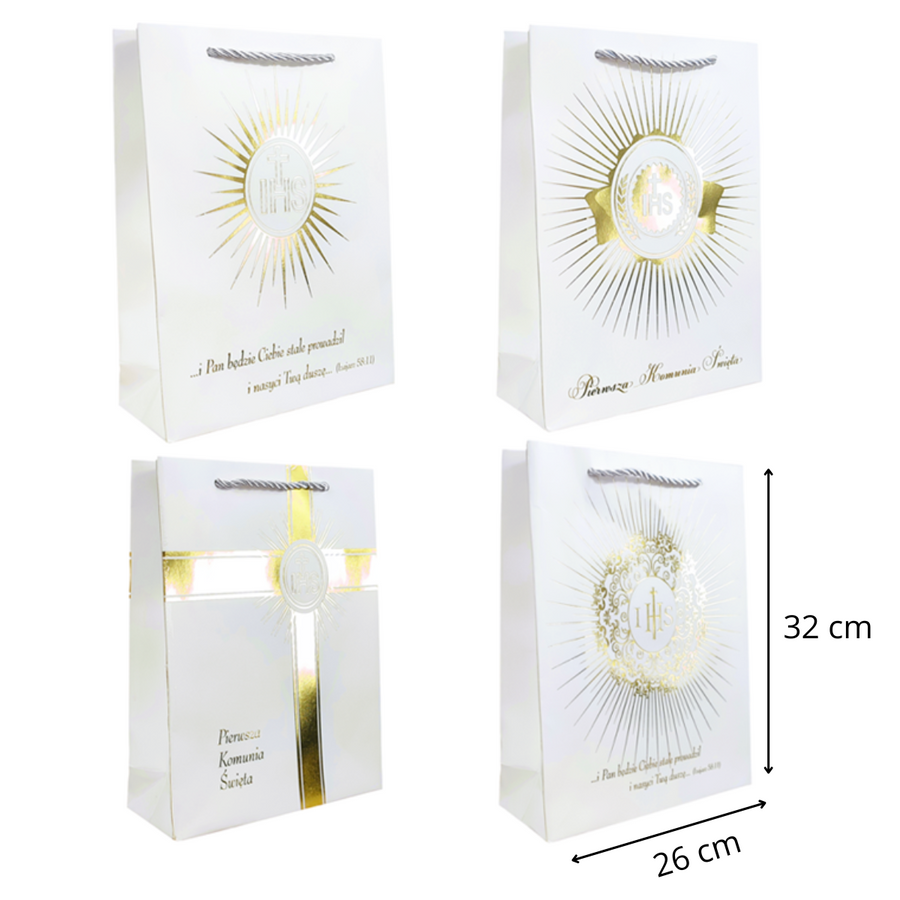 Elegancka torebka prezentowa idealna na upominek z okazji Pierwszej Komunii Świętej. Wykonana z wysokiej jakości papieru, ozdobiona delikatnymi, komunijnymi motywami. Dostępna w różnych wzorach, które podkreślają uroczysty charakter wydarzenia.