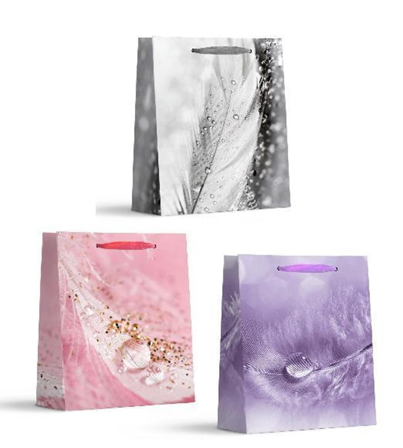 Przedstawiamy naszą wyjątkową torebkę prezentową z motywem piórka i kropel wody, z delikatnym brokatowym zdobieniem, w 3 kolorach do wyboru.