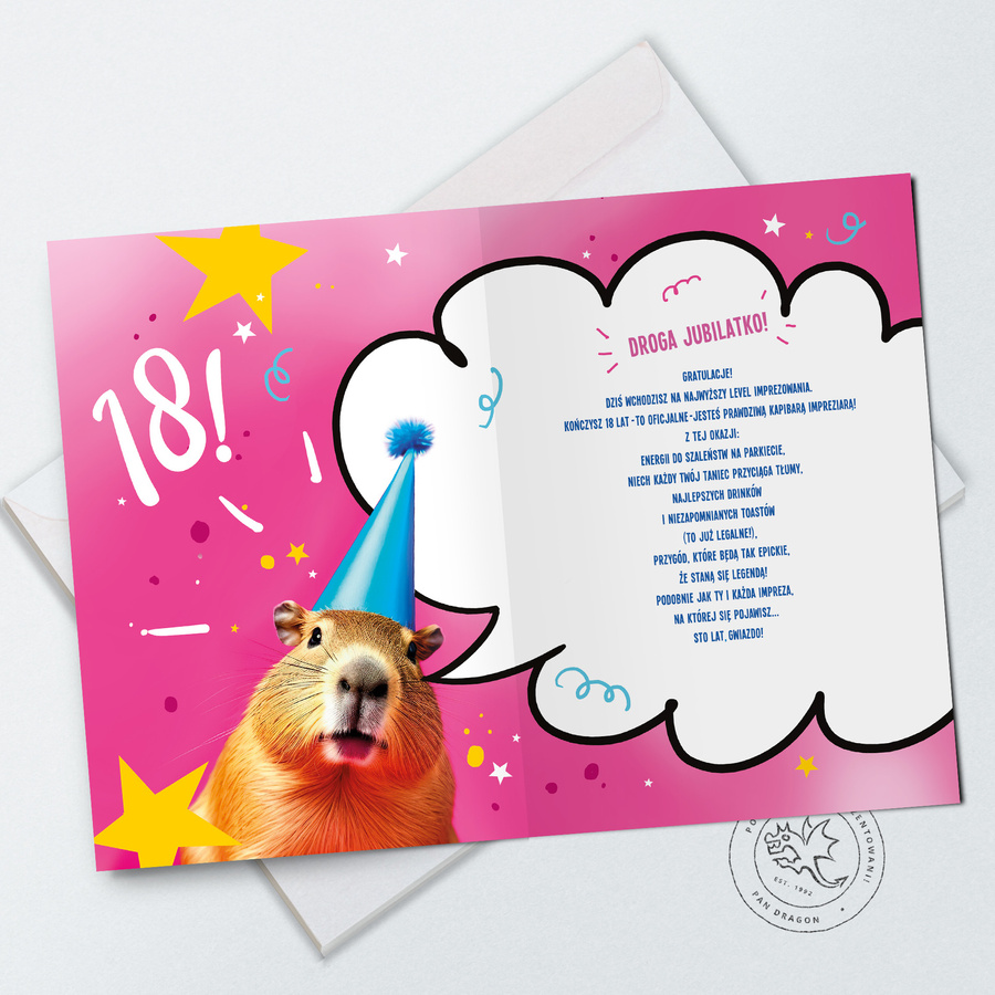 Nowatorski i elegancki karnet z okazji 18-stych urodzin w rozmiarze XXL, ozdobiony kolorowa, zabawną grafiką Kapibary Impreziary