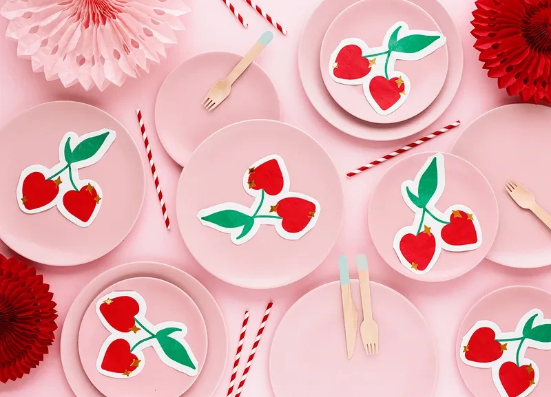 - Papierowe serwetki w kształcie soczystych wiśni, ozdobione złotymi elementami.