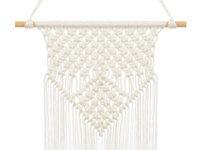 Pleciona makrama w kolorze złamanej bieli to stylowa i boho dekoracja, która doda wnętrzu naturalnego uroku i przytulności. Idealna do salonu, sypialni czy pokoju dziecięcego, świetnie komponuje się z wnętrzami w stylu skandynawskim, boho czy rustykalnym.