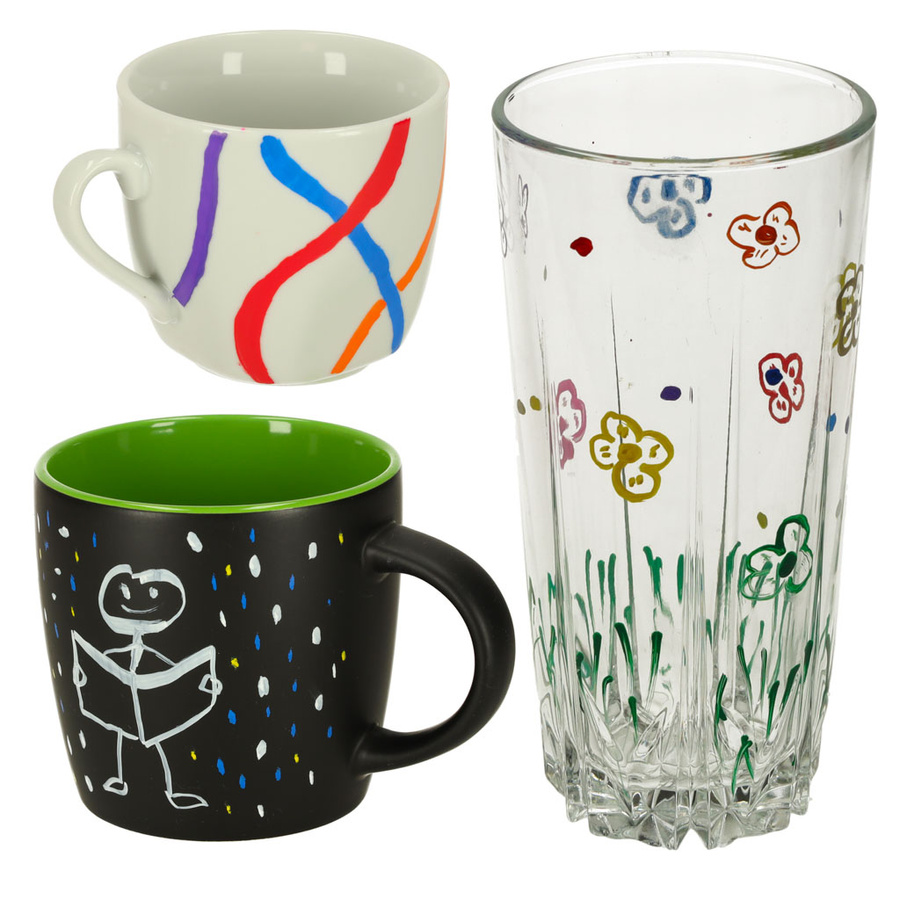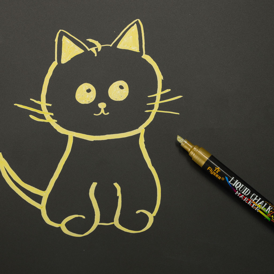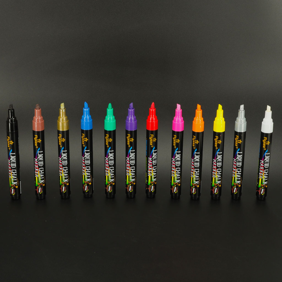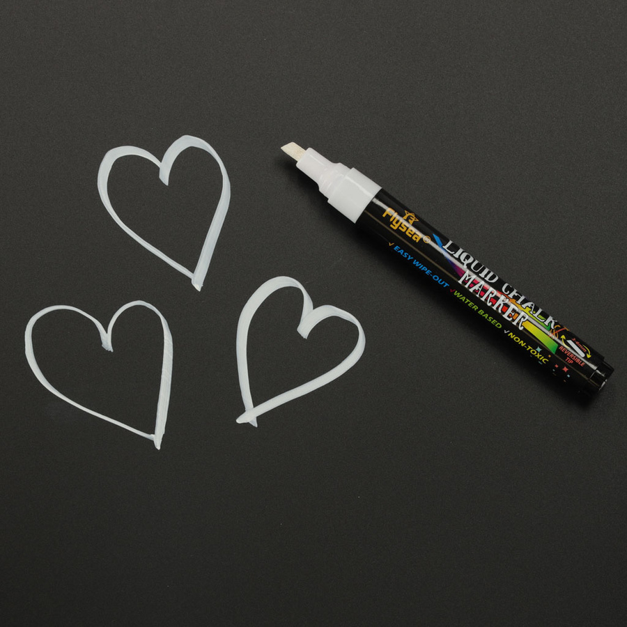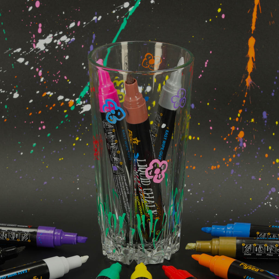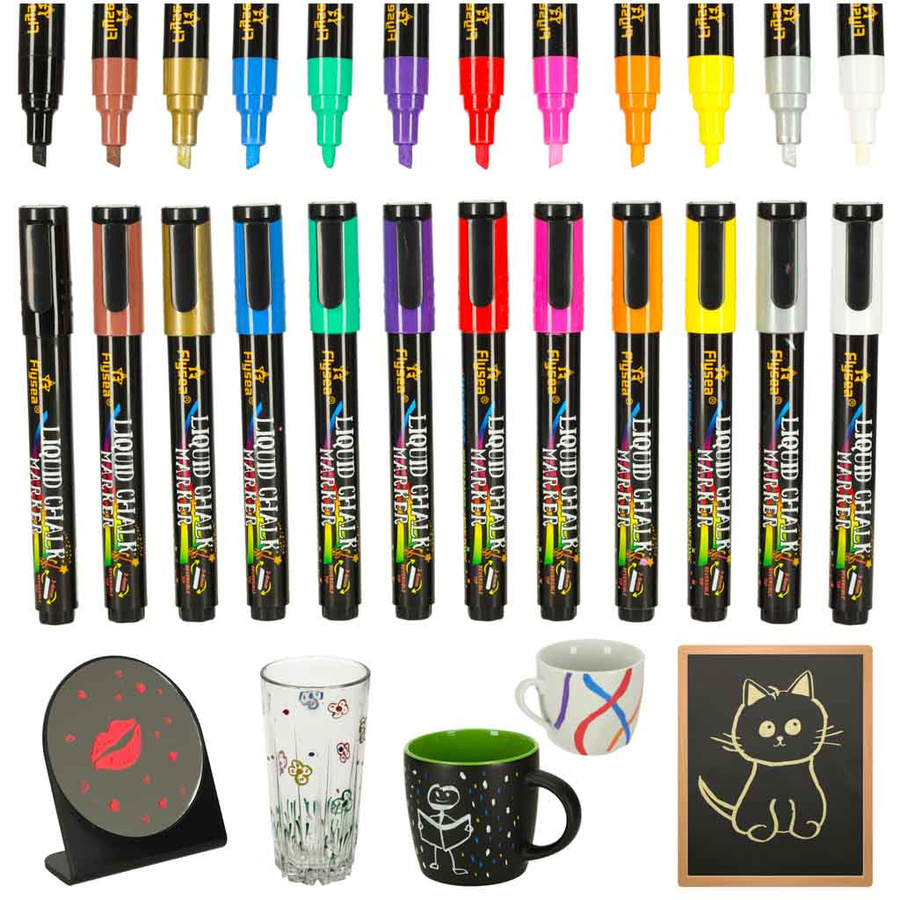 Zestaw mazaków kredowych to narzędzie do rysowania na różnorodnych gładkich powierzchniach, takich jak szkło, lustra, kubki, tablice suchościeralne i inne. Dzięki tuszowi kredowemu, napisy i rysunki łatwo zmyć, wystarczy przetrzeć powierzchnię ściereczką. Mazaki mają dwie obracalne końcówki – okrągłą i skośną.