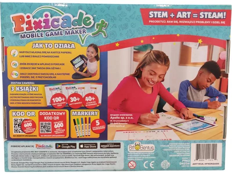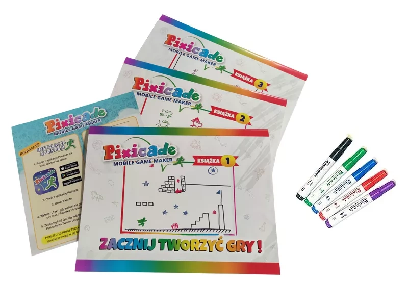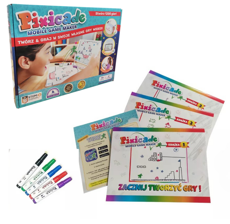 Zestaw Pixicade składa się z kartek do rysowania, pięciu zmywalnych markerów, oraz z dedykowanej aplikacji mobilnej, dostępnej na smartfony i tablety. Proces tworzenia gier jest prosty i intuicyjny - możesz wykorzystać swoją wyobraźnię i talent artystyczny, aby stworzyć postacie, poziomy, oraz scenariusze gier, rysując je na kartce, a następnie zeskanować swoje rysunki za pomocą aplikacji. W ten sposób stworzone kreacje ożywają na ekranie, dając Ci możliwość interakcji i kontroli nad własnymi dziełami.
