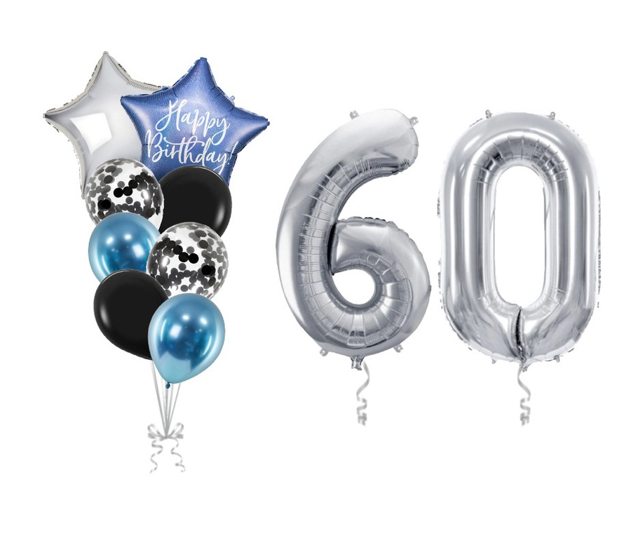 W zestawie znajdziesz balony w odcieniach srebra, niebieskiego i czerni, które tworzą harmonijną kompozycję. Balony o różnych kształtach, w tym srebrna cyfra "60", dodadzą uroku i blasku Twojej imprezie.