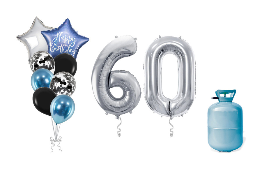 Zestaw balonów na 60 urodziny bukiet balonowy z helem srebrno niebieski