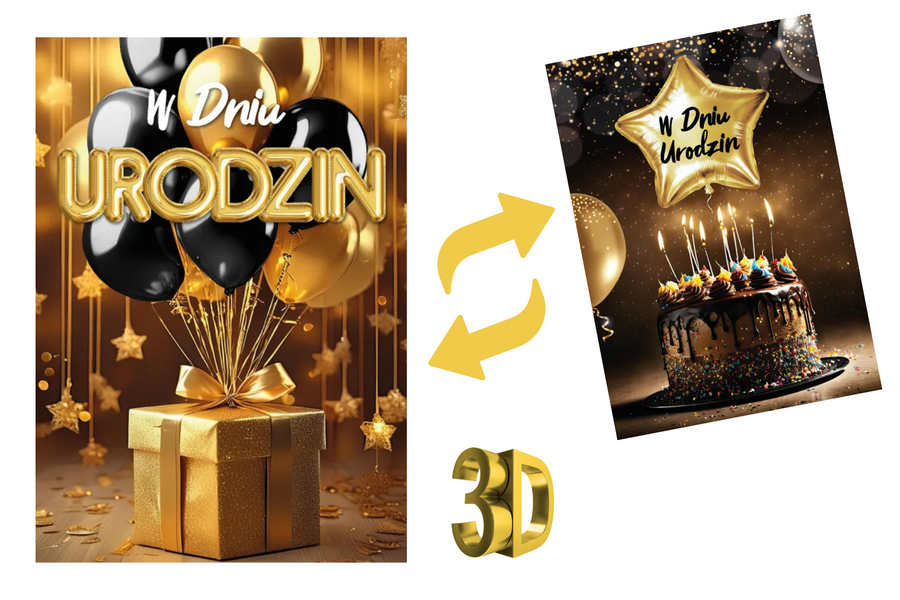 - Kartka urodzinowa z trójwymiarowym efektem dwóch zmieniających się grafik.