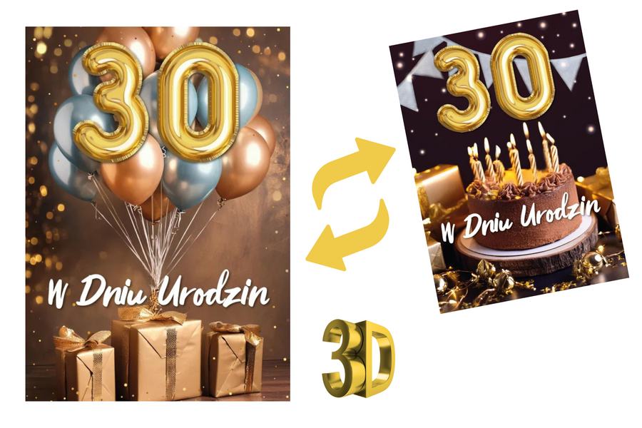 • Kartka z życzeniami na 30- ste urodziny z trójwymiarowym efektem dwóch zmieniających się grafik.
