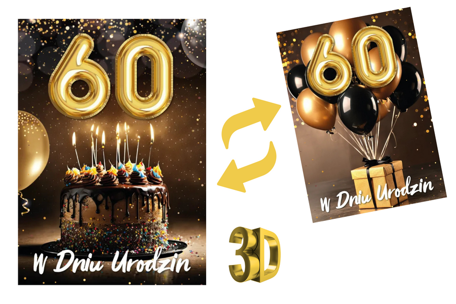 - Kartka z życzeniami na 60- ste urodziny z trójwymiarowym efektem dwóch zmieniających się grafik.