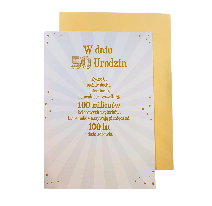 - Kartka z życzeniami na 50- ste urodziny z grafiką banknotów i zabawnym tekstem.