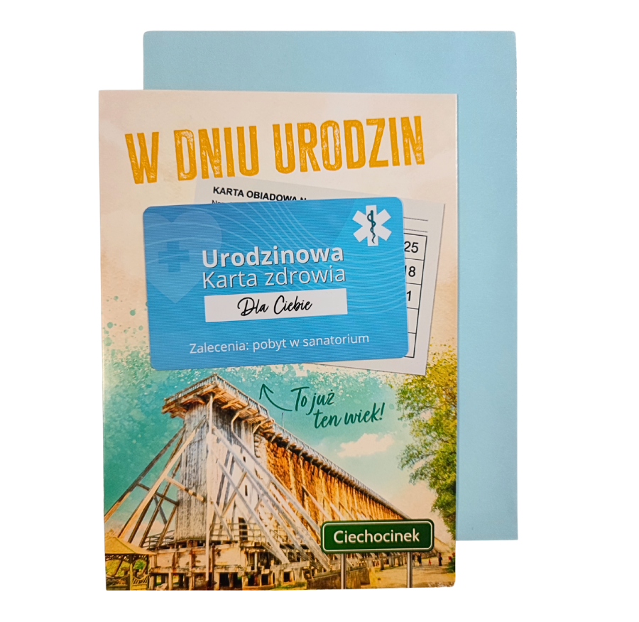 Wyjątkowy sposób na przekazanie życzeń urodzinowych! Ta niebanalna kartka łączy klasyczny urok z humorystycznym akcentem – dołączona urodzinowa karta zdrowia z kartą obiadową do sanatorium w Ciechocinku i zabawnym tekstem że, "to już ten wiek" . To idealny prezent dla osób, które cenią humor i potrafią spojrzeć na życie z przymrużeniem oka.