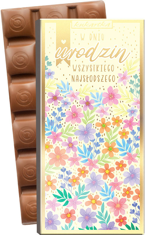 Pyszna, aksamitna mleczna czekolada z uroczą, kwiatową okładką i napisem "W Dniu Urodzin – Wszystkiego Najsłodszego" to doskonały prezent dla każdego łasucha. Idealna jako dodatek do upominku lub samodzielny gest pełen życzliwości i słodyczy.
