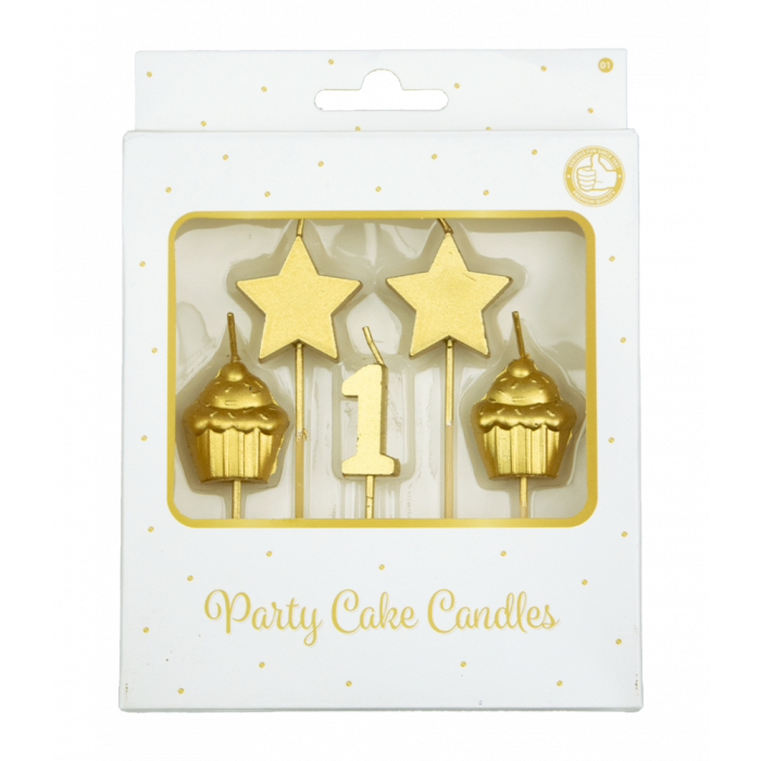 • Zestaw składa się z 5 sztuk świeczek (2 gwiazdki, 2 babeczki, cyfra 1)
