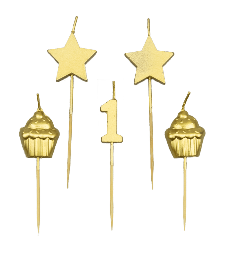 Liczba 1: Zestaw zawiera świeczki  w różnych kształtach: 2 gwiazdki, 2 babeczki i cyferkę 1. To doskonały sposób na podkreślenie ważnego wydarzenia w życiu dziecka.