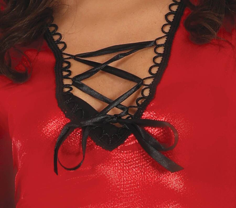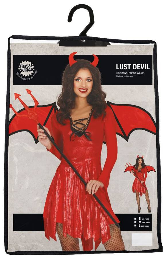 - Dodatki: Kostium zawiera również diabelskie, czerwone rogi na opasce.