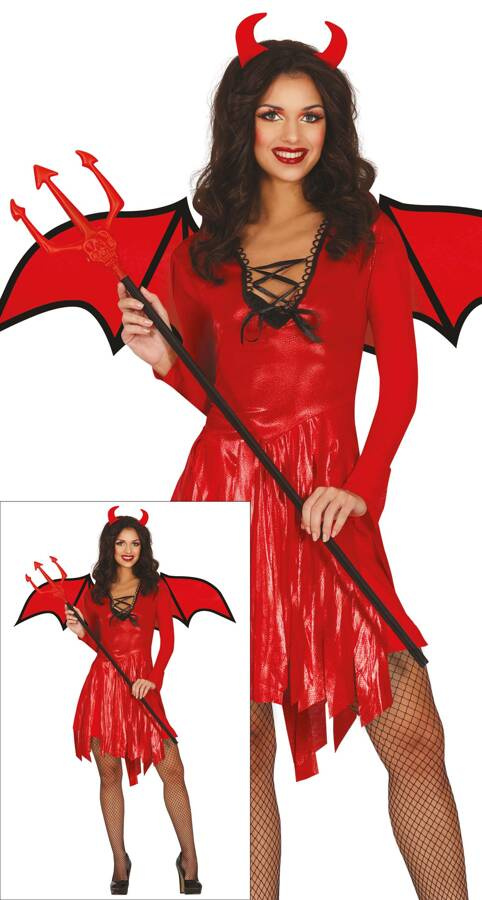 - Zestaw składający się z czerwonej połyskującej sukienki, skrzydeł i rogów, dzięki któremu zamienisz się w diablicę