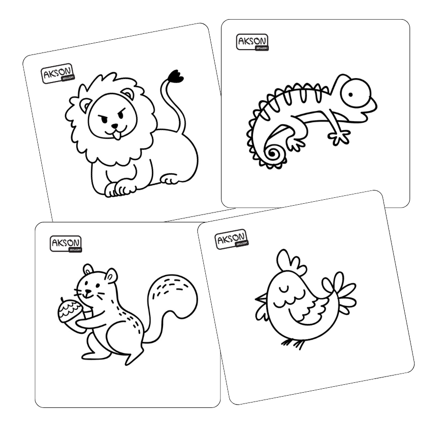 • Zestaw 20 kart z grafiką zwierząt odpowiadającym 20 obrazkom na innych naszych produktach ( piłce do kolorowania czy kostce)