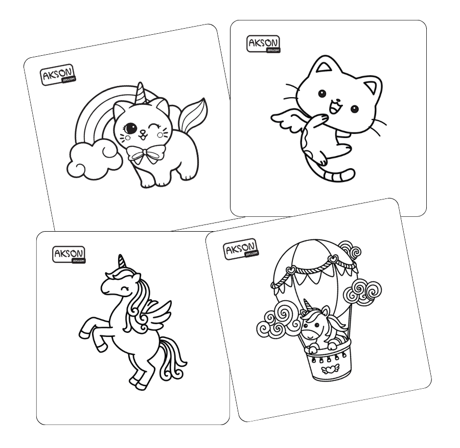 - Zestaw 20 kart z grafiką jednorożców odpowiadającym 20 obrazkom na innych naszych produktach ( piłce do kolorowania czy kostce)