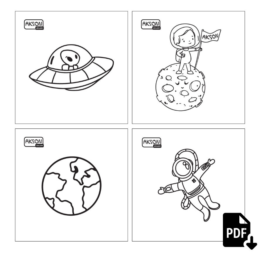 - Karty z grafiką kosmosu odpowiadającym 20 obrazkom na innych naszych produktach ( piłce do kolorowania czy kostce).