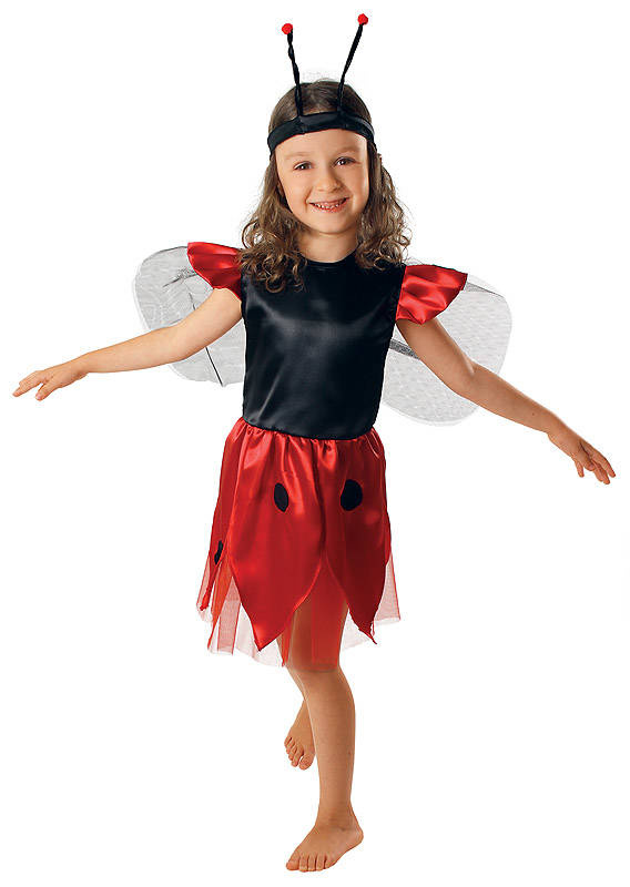 Kostium przepięknej biedroneczki składający się z cudownej sukienki z górą w kolorze czarnym oraz dołem i rękawkami w kolorze czerwonym, które nakrapiane są czarnymi kropkami. Do sukienki mocowane są skrzydła. W zestawie znajduje się również opaska z czułkami.