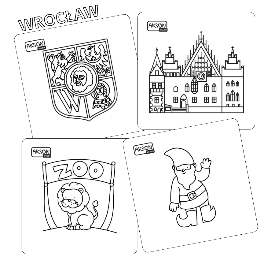- Zestaw 15 kart z grafiką WROCŁAW, odpowiadającą 15 obrazkom na innych naszych produktach ( piłce do kolorowania czy kostce)