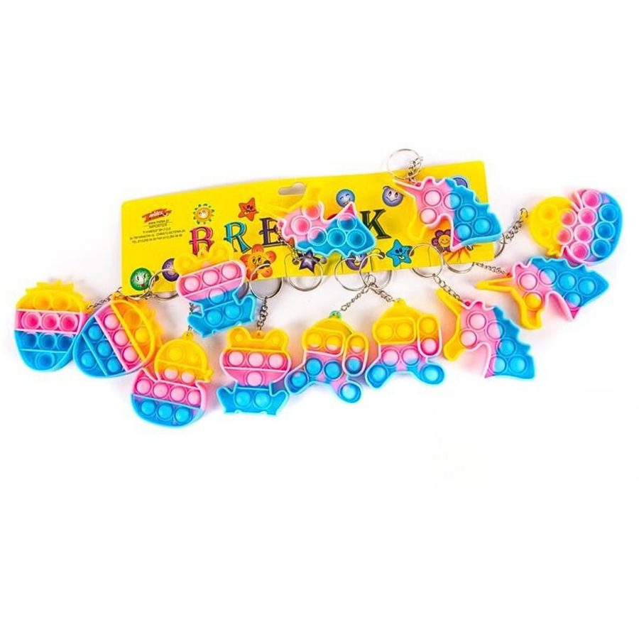 • Kolorowy brelok Pop It z strzelającymi bąbelkami w kilku kształtach.